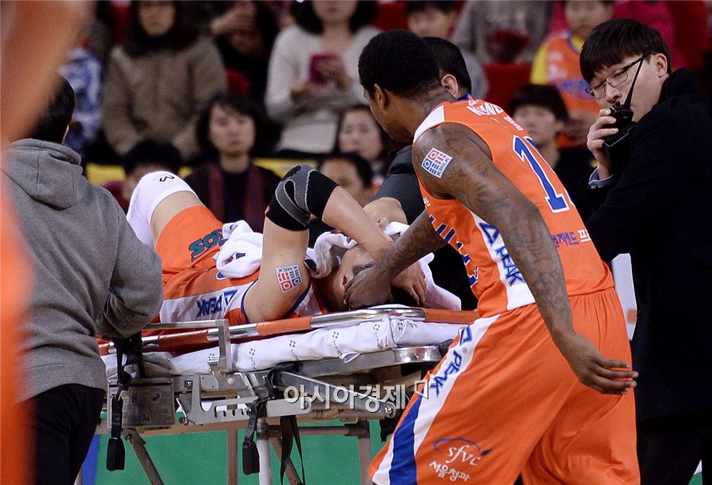 [인천=아시아경제 김현민 기자] 프로농구 인천 전자랜드와 부산 kt의 경기가 19일 인천 삼산월드체육관에서 열렸다. 전자랜드 포웰이 왼쪽 무릎으로 실려 나가는 정영삼을 위로하고 있다. 김현민 기자 kimhyun81@asiae.co.kr<ⓒ세계를 보는 창 경제를 보는 눈, 아시아경제(www.asiae.co.kr) 무단전재 배포금지>