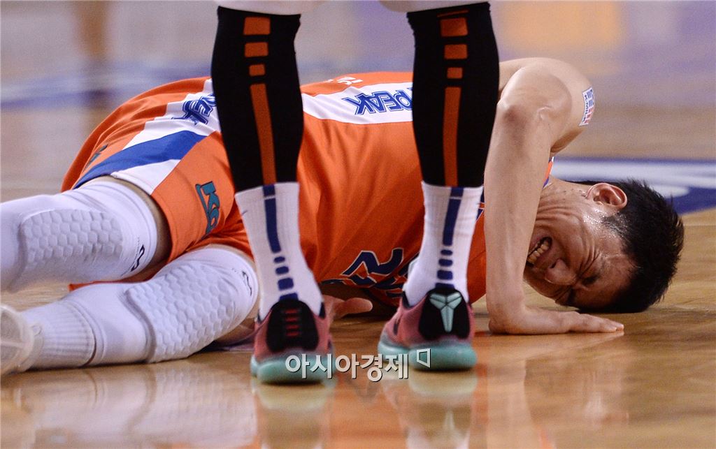 [인천=아시아경제 김현민 기자] 프로농구 인천 전자랜드와 부산 kt의 경기가 19일 인천 삼산월드체육관에서 열렸다. 전자랜드 정영삼이 코트에 쓰러져 왼쪽 무릎을 부여잡고 고통스러워하고 있다. 김현민 기자 kimhyun81@asiae.co.kr<ⓒ세계를 보는 창 경제를 보는 눈, 아시아경제(www.asiae.co.kr) 무단전재 배포금지>