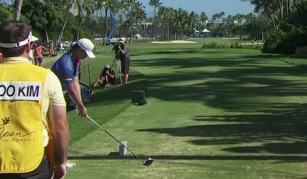소니오픈 최종일 김시우가 티 샷하기 직전 캐디가 얼라인먼트를 봐주고 있는 모습이다. 사진=골프뉴스넷