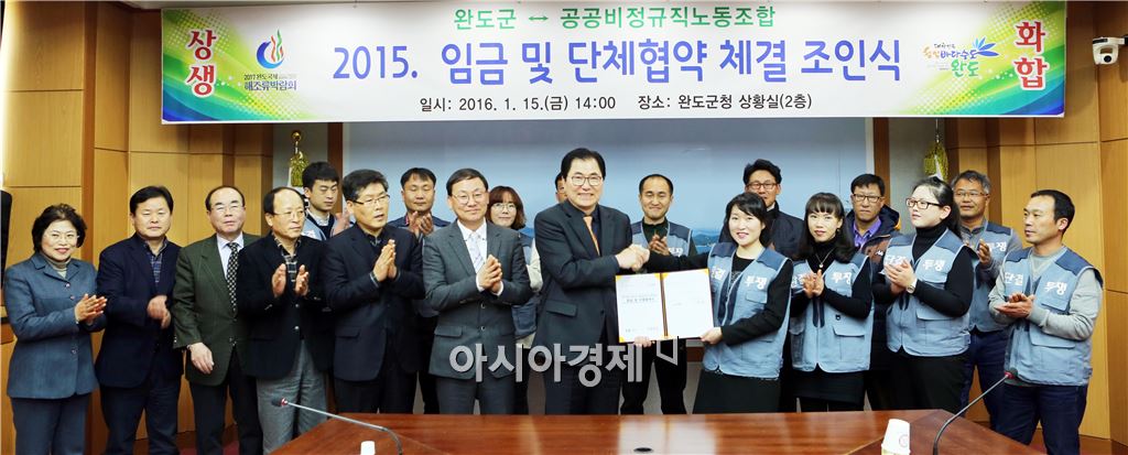 완도군(군수 신우철)과 완도군공공비정규직노동조합(위원장 이성일)이 지난 15일 2015 임금 및 단체협약을 체결하고 조인식을 가졌다. <br />