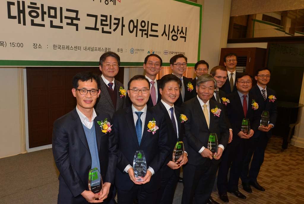 [아시아경제 김대섭 기자] '그린세상 그리는 그림같은 자동차'올해로 6회를 맞은 '2016 대한민국 그린카 어워드' 시상식이 21일 오후 서울 프레스센터에서 열렸다. 이날 행사에는 산업통산자원부와 환경부, 자동차업계 등 친환경 차산업에 기여한 관계자 20여명이 참석했다.이세정 아시아경제 사장은 인사말에서 "세계 자동차 업계는 치열한 경쟁과 점점 강화되는 각종 환경규제 하에 더 안전하면서도 친환경적인 자동차 개발에 사활을 걸고 있다"며 "전자ㆍ통신ㆍ모터기술 등 혁신적인 신기술을 융합해 운전자의 안전성과 편의성을 극대화 할 수 있는 차량 개발에 전략을 다하고 있다"고 소개했다. 이 행사는 미래성장동력으로 꼽히는 친환경 자동차 산업의 현재를 되짚어보고 미래를 준비하자는 취지로 2011년부터 매년 개최되고 있다. 친환경차는 다가올 미래형 자동차의 핵심 키워드인 동시에 글로벌 무한 경쟁에서 살아남기 위한 자동차 업계의 생존을 건 화두다. 박일준 산업통산자원부 산업정책실장은 축사를 통해 "전기차와 수소연료전지차 등 친환경차에 대한 관심은 계속 커지고 있다"며 "이렇게 자동차산업의 패러다임이 바뀌어나갈 때 완성차나 부품업체, 배터리, 정보통신 관련 기업들이 흐름에 뒤쳐지지 않고 더 성장할 수 있기를 기대한다"고 말했다. 이어 "전기차의 경우 여러가지를 고려해 볼 때 제주도가 보급 확대와 성공모델을 만들 수 있는 여건을 갖추고 있고 여기서 시범적으로 제도를 운영해 보고 이를 전국적으로 확산시킬 수 있도록 할 계획"이라고 설명했다. 특히 올해에는 수상부문을 완성차와 부품업체 외에 수입차도 포함시켰다. 수입차가 이미 국내 시장에서 20%의 시장점유율을 기록하고 있고 기술면에서 뛰어난 역량을 보이고 있는 만큼 수입차부문의 시상을 확대해 나갈 계획이다. 이번 행사에서 산업통상자원부장관상인 그린카 부문은 BMW그룹코리아의 김효준 사장이 선정됐다. 김효준 사장은 2014년 민간 전기차 충전 사업자인 포스코ICT와 더불어 전국 이마트 80개 매장에 충전기를 설치했다. 또 제주도에도 약 350기를 기중하는 등 친환경차 산업의 기반 구축과 성장을 위해 적극 활동하고 있다. 그린테크놀로지상(산업부장관상)은 가장 작고 오래 가면서도 안전한 전기차 배터리 개발 기술로 세계 1위의 위상을 공고히 하고 있는 LG화학이 수상했다. 환경부장관상인 그린이노베이션상은 SK이노베이션과 르노삼성자동차가 수상하는 영광을 안았다. SK이노베이션은 지속적인 투자를 통해 중국 전기차 배터리 시장을 선도하고 있고 국내외에서 다양한 성과를 내고 있다. 르노삼성자동차는 친환경차의 수준을 한 단계 높이는 기술 개발과 차량 출시에 힘쓰고 있다.아시아경제신문사장상인 그린디자인상과 그린R&D상은 각각 한국지엠, 효성이 수상했다. 한국지엠은 쉐보레 스파크 전기차를 통해 친환경차의 디자인 혁신을 일으키고 있다. 효성은 탄소섬유 등 신소재를 통해 친환경차의 필수 요소인 경량화에 큰 역할을 하고 있다. 그린에너지상(아시아경제신문사장상)은 이산화탄소 배출량은 줄이고 에너지 효율성이 높인 제품 개발에 주력한 쌍용자동차가 받았다. 김대섭 기자 joas11@asiae.co.kr<ⓒ세계를 보는 창 경제를 보는 눈, 아시아경제(www.asiae.co.kr) 무단전재 배포금지>