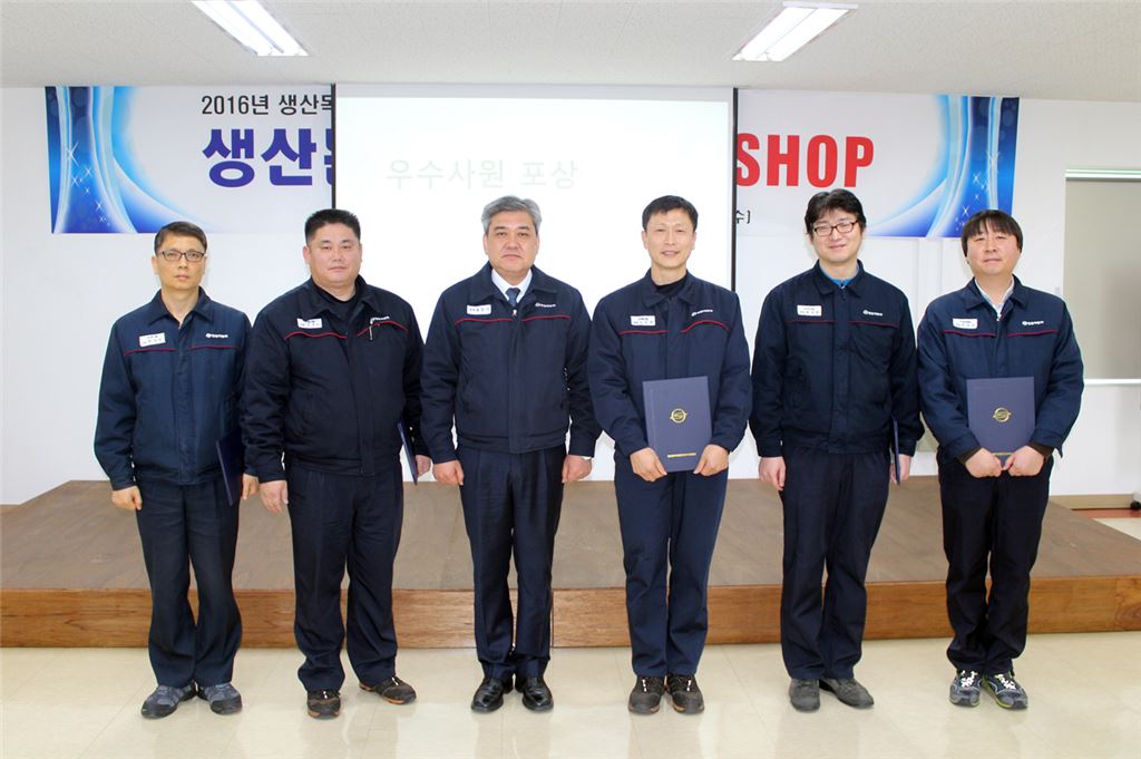 쌍용차는 지난 21일 평택공장에서 생산물량 증대와 완벽한 품질의 제품 생산을 다짐하는 2016년 생산본부 목표달성 결의대회를 가졌다. 쌍용차 생산본부 송승기 전무(왼쪽에서 세 번째)가 지난해 우수사원으로 선정된 생산본부 직원들과 기념촬영을 하고 있다. <br /> <br />