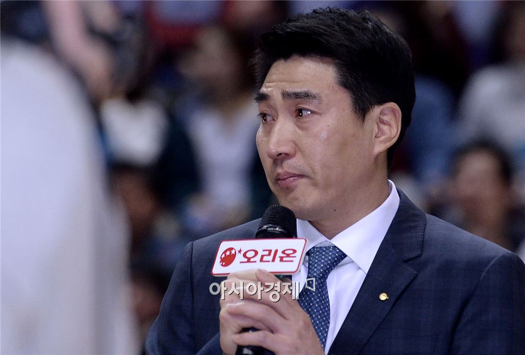[고양=아시아경제 김현민 기자] 프로농구 고양 오리온과 인천 전자랜드의 경기가 22일 고양체육관에서 열렸다. 오리온 임재현 코치가 하프타임 때 열린 은퇴식에서 울먹이고 있다. 김현민 기자 kimhyun81@asiae.co.kr<ⓒ세계를 보는 창 경제를 보는 눈, 아시아경제(www.asiae.co.kr) 무단전재 배포금지>