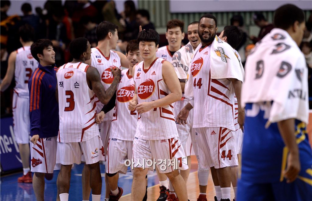 승리를 자축하는 고양 오리온 선수들[사진=김현민 기자]