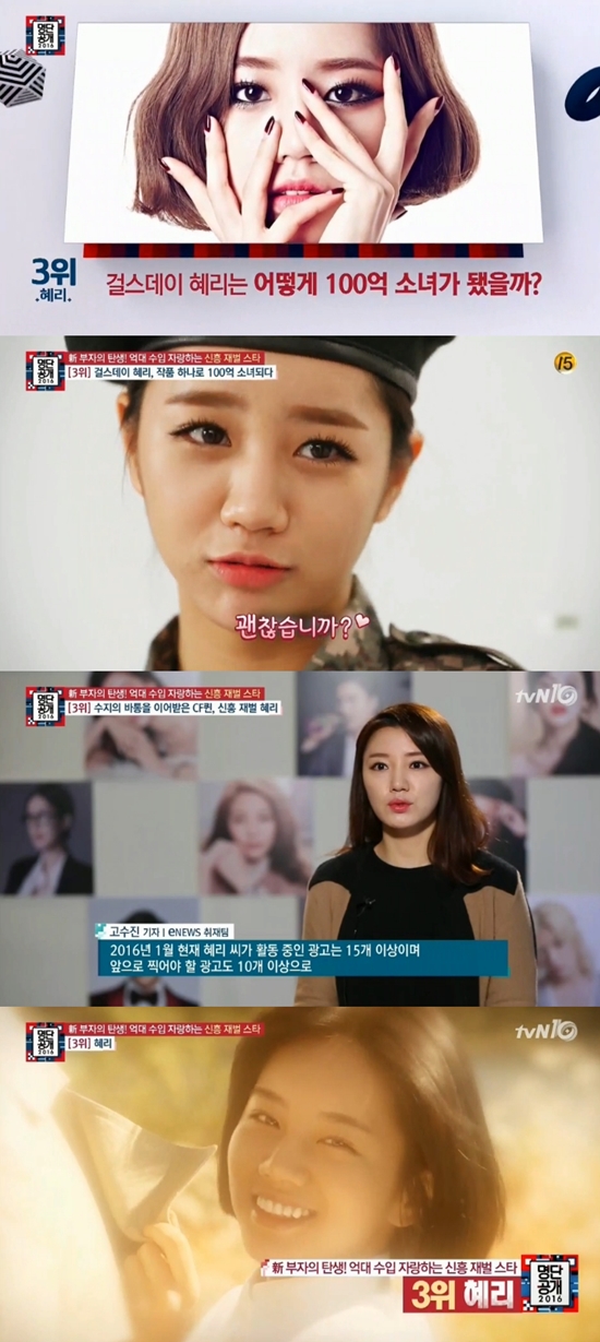 [아시아경제 온라인이슈팀] 25일 방송된 tvN ‘명단공개 2016’에서 걸스데이 혜리가 억대 수입 자랑하는 신흥 재벌 스타 3위를 차지했다.혜리는 지난 2014년 MBC '일밤-진짜 사나이'에서 남심을 녹이는 애교로 안방극장을 사로잡으며 스타덤에 올랐다. 특히 최근 인기리에 종영된 tvN '응답하라 1988'에서 덕선역으로 분해 시청자들의 많은 사랑을 받았다. 이렇게 혜리는 ‘응답하라 1988’을 통해 연기돌로서의 가능성을 입증한 데 이어 광고로 역시 큰 수익을 얻었다.관계자에 따르면 "혜리씨 모델료는 기존 대비 2배 이상 상승해 4억~5억으로 알려졌다. 2016년 1월 현재 혜리씨는 15개의 광고를 찍었고 앞으로 10개 이상의 광고를 찍을 것으로 알려졌다"고 말하며 혜리가 수지에 이어 100억 소녀가 됐음을 밝혔다.혜리 역시 한 예능 프로그램을 통해 "송파에 계신 부모님께 원래 살던 집보다 2배 이상 큰 집을 사드렸다"고 밝히기도 했다.온라인이슈팀 issue@asiae.co.kr<ⓒ세계를 보는 창 경제를 보는 눈, 아시아경제(www.asiae.co.kr) 무단전재 배포금지>