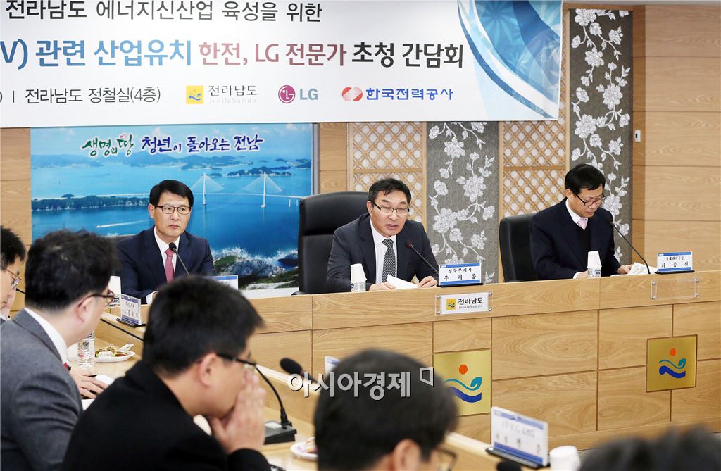 전라남도는 26일 도청에서 ㈜LG와 한전의 전기자동차(EV)전문가를 초청, 전남 에너지산업 10개년 계획, EV산업의 현재와 미래, 국내외 전기차 동향 및 사업화 방안, 관련 산업 투자유치전략 등을 논의하는 간담회를 가졌다. 사진제공=전남도