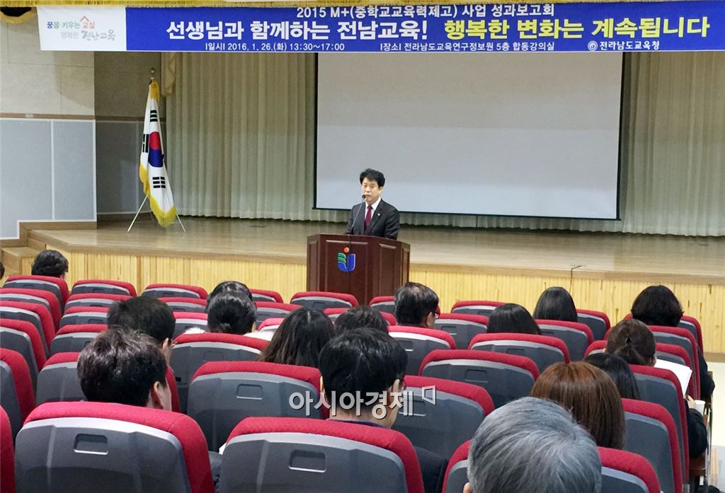 전남도교육청(교육감 장만채)은 26일 전남교육연구정보원에서 중학교 교육역량 제고를 위한 'M+(중학교 교육력 제고) 사업' 지원을 위해 학교장 및 담당교사, 교육지원청 업무담당 장학사를 대상으로 성과보고회를 가졌다.<br />