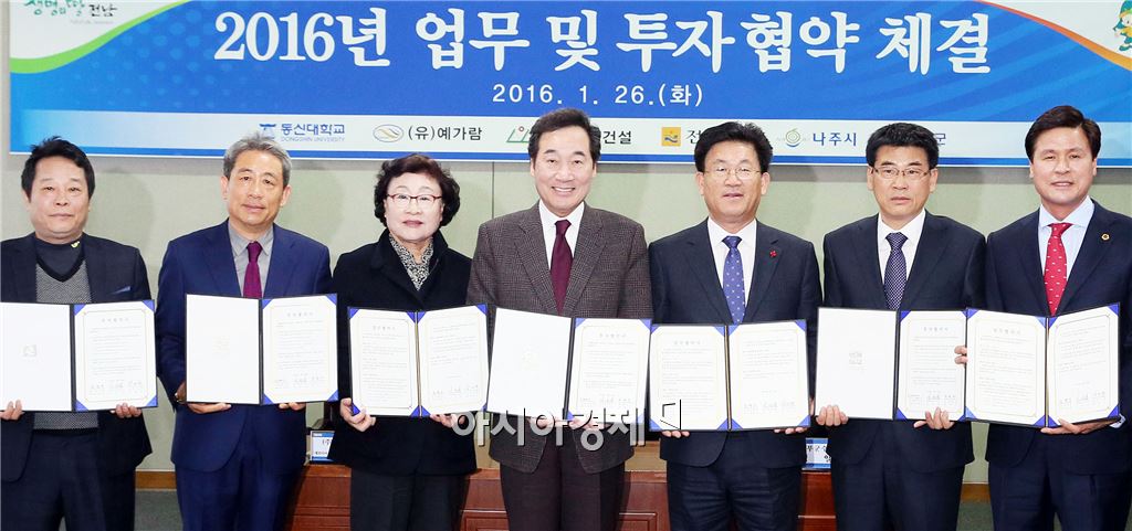 "26일 동신대 등과 투자협약…담양 새꿈도시 조성도" [아시아경제 노해섭 기자]전라남도가 26일 나주 빛가람혁신도시에 한방병원과 관광호텔을 건립하고, 담양에 새꿈도시를 조성하는 업무협약 및 투자협약을 시작으로 올해 본격적인 투자유치 활동에 나섰다. 올해 유치 목표는 275개 기업이다.전라남도는 이날 오전 도청 서재필실에서 이낙연 도지사와 강인규 나주시장, 김필식 동신대학교 총장, 2개 기업 대표가 참석한 가운데 1천 195억 원 규모의 투자협약을 체결했다. 이에 따른 고용 창출 규모는 261명이다.협약 내용은 동신대학교의 한방병원 건립 등 빛가람 캠퍼스 조성, 유한회사 예가람(대표 박경석)의 나주 혁신도시 내 관광호텔 건립, ㈜태호건설(대표 김영주)의 담양 새꿈도시 조성 등이다.협약에 따라 동신대학교는 2022년까지 광주전남공동혁신도시 산학연클러스터 1만 4천 538㎡ 부지에 450억 원을 들여 한방병원 중심의 의료 및 교육시설을 갖춘 빛가람 캠퍼스를 조성한다.빛가람 캠퍼스가 완공되면 지역 주민들에게 양질의 의료 서비스를 제공할 뿐만 아니라 혁신도시의 중요한 의료 기반시설로 자리 잡을 전망이다. 또한 빛가람 캠퍼스 조성을 계기로 한전 등 혁신도시 입주 공기업과 에너지·ICT 분야에서 산학 협력 성과가 기대된다.(유)예가람은 광주전남공동혁신도시 부지 6천312㎡에 400억 원을 투자해 300실 규모의 관광호텔을 건립한다. KTX와 무안국제공항을 통해 전남을 방문하는 국내외 관광객과 한국전력공사 등 16개 공공기관을 방문하는 손님들에게 최고급 숙박 서비스를 제공할 계획이다.㈜태호건설은 전원생활을 꿈꾸는 베이비 붐 세대 은퇴자들을 겨냥해 담양 대덕면 문학리 일원 16만 1천 200㎡에 200세대 규모의 주거시설과 의료·편의시설을 갖춘 새꿈도시를 조성한다. 2018년까지 345억 원을 투자할 예정이며 친환경 주거기능에 자립적 경제활동 프로그램을 더함으로써 은퇴도시의 새로운 모델을 제시하고 지역 경제 활성화에도 기여한다는 방침이다.이낙연 지사는 인사말을 통해 “대한민국 50년간의 번영을 이어갈 뚜렷한 활로는 에너지신산업에서 찾을 수밖에 없다”며 “나주 혁신도시는 공공기관이 들어오고 주거시설이 들어서는 1단계를 넘어 이번 투자협약을 계기로 대학 캠퍼스와 호텔, 병원이 들어서는 2단계 발전 국면에 접어들었고, 머잖아 자족도시의 면모를 갖추게 될 것”이라고 강조했다. 이어 "2015년은 이촌향도보다 이도향촌의 인구가 많았던 첫 해였던 만큼 새꿈도시 같은 전원마을 투자가 매우 유망하다”며 “투자기업의 성공이 전남의 성공이자 도지사의 성공이라 생각하고 열심히 지원하겠다”고 덧붙였다.전라남도는 올해 기능성 화학소재, 바이오·백신, 자동차 고급부품 및 튜닝, 에너지 등 비교우위 신산업 분야를 중점으로 275개 기업을 유치할 계획이다. 목표 달성을 위해 일선 시군, 출연기관, 지역 경제단체 등과 종합적인 협력체제를 구축하고 입지보조금 지원 대상 확대 등 투자기업 인센티브도 한층 강화할 방침이다.노해섭 기자 nogary@<ⓒ세계를 보는 창 경제를 보는 눈, 아시아경제(www.asiae.co.kr) 무단전재 배포금지>