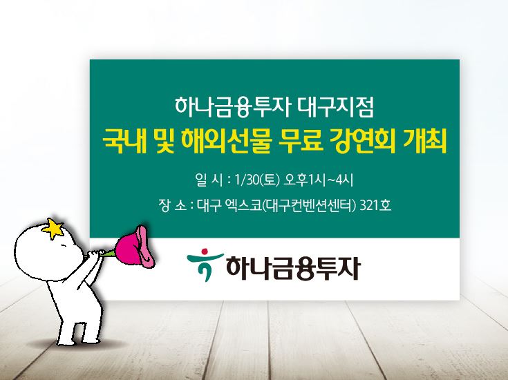 [아시아경제 최서연 기자] 하나금융투자 대구지점은 국내 및 해외선물 무료 강연회를 개최한다고 27일 밝혔다.강의는 오는 30일 오후 1시부터 4시까지 대구 엑스코(대구컨벤션센터) 321호에서 열린다.강사는 슈어넷과 아프리카 프로주식클럽에서 파생부문 대표전문가로 활동하고 있는 ‘전쟁의 여신’ 전문가다.총 3부로 진행되며 1부에는 국내선물 차트활용법을, 2부에는 해외선물 매매기법을 설명하고, 3부에서는 실전매매 필수체크사항을 설명하며 마무리된다. 또한, 해당 강의 자료는 책자로 제공될 예정이다.참가비용은 무료이며 선착순 100명까지 참석할 수 있다. 단, 사전에 신청한 투자자만이 참석이 가능하다. 신청 및 문의는 하나금융투자 대구지점(053-656-8662)으로 하면 된다.최서연 기자 christine89@asiae.co.kr<ⓒ세계를 보는 창 경제를 보는 눈, 아시아경제(www.asiae.co.kr) 무단전재 배포금지>