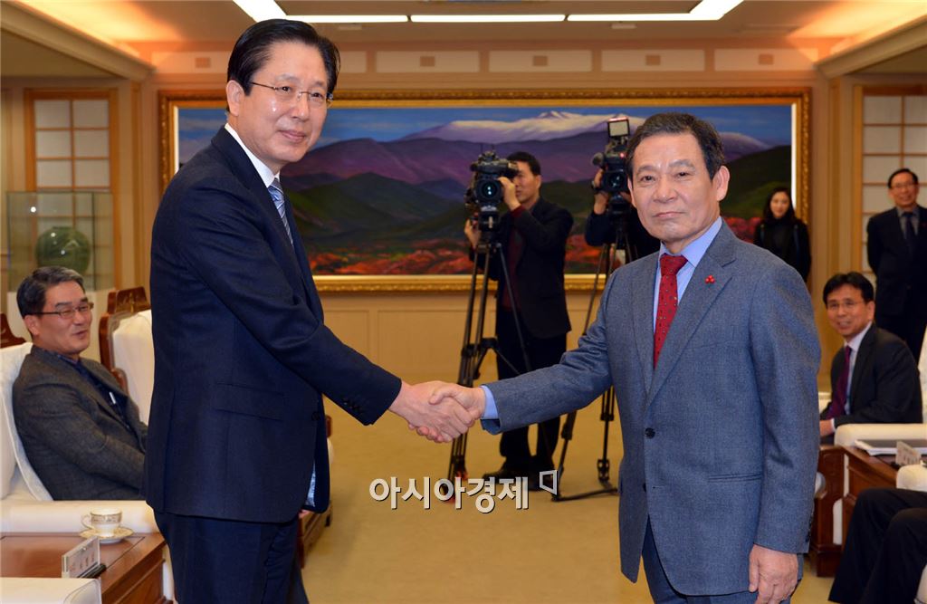 삼성전자 서병삼 부사장(생활가전사업부장, 왼쪽)이 27일 오후 시청 3층 비즈니스룸에서 윤장현 광주광역시장에게 최근 지역에서 이슈가 되고 있는 삼성전자 광주사업장의 생산라인 베트남 이전과 관련한 삼성 측의 공식입장을 설명하고 악수를 하고있다.사진제공=광주시