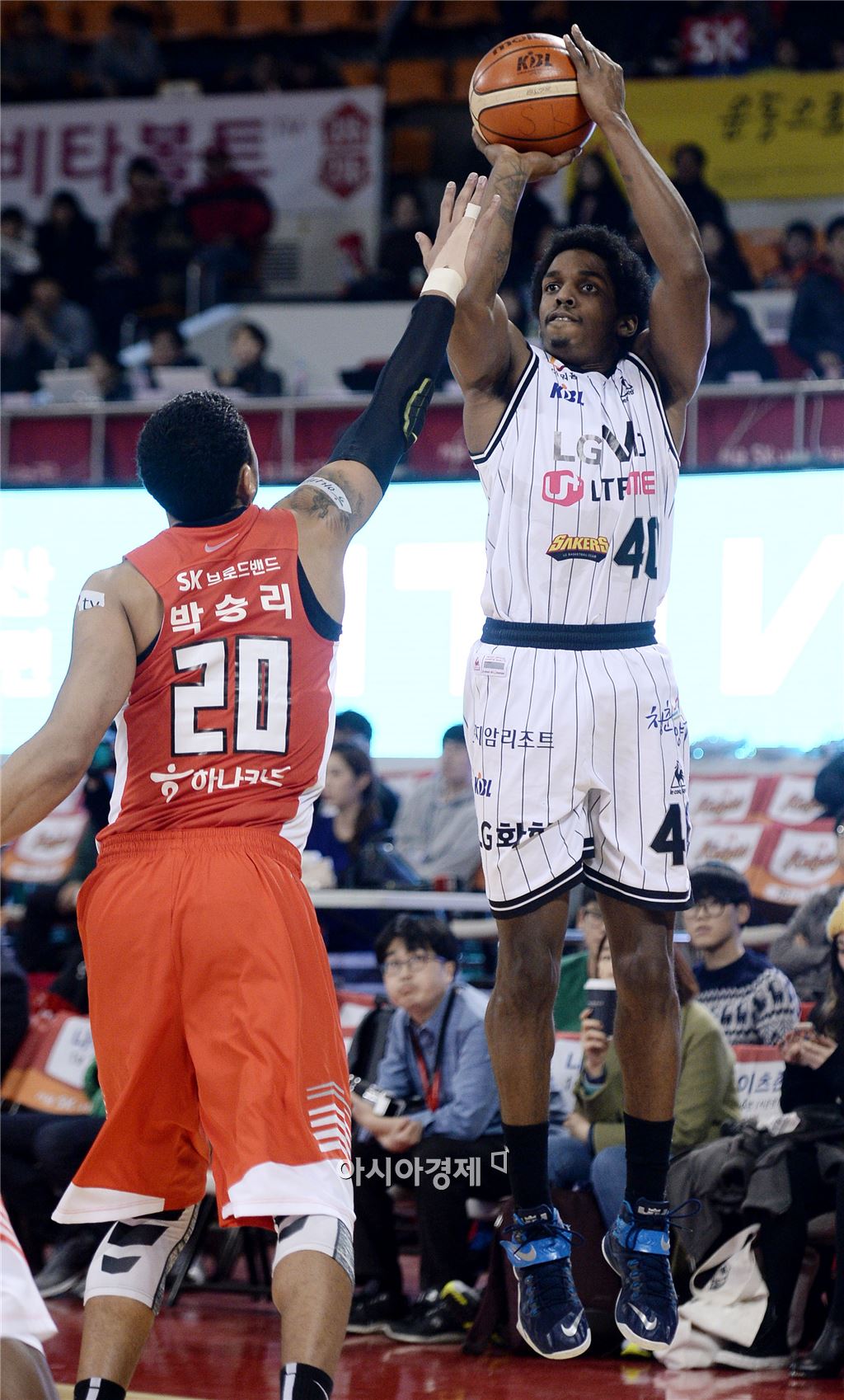 [잠실=아시아경제 김현민 기자] 프로농구 서울 SK와 창원 LG의 경기가 27일 잠실학생체육관에서 열렸다. LG 샤크가 상대 수비를 뚫고 슛하고 있다. 김현민 기자 kimhyun81@asiae.co.kr<ⓒ세계를 보는 창 경제를 보는 눈, 아시아경제(www.asiae.co.kr) 무단전재 배포금지>