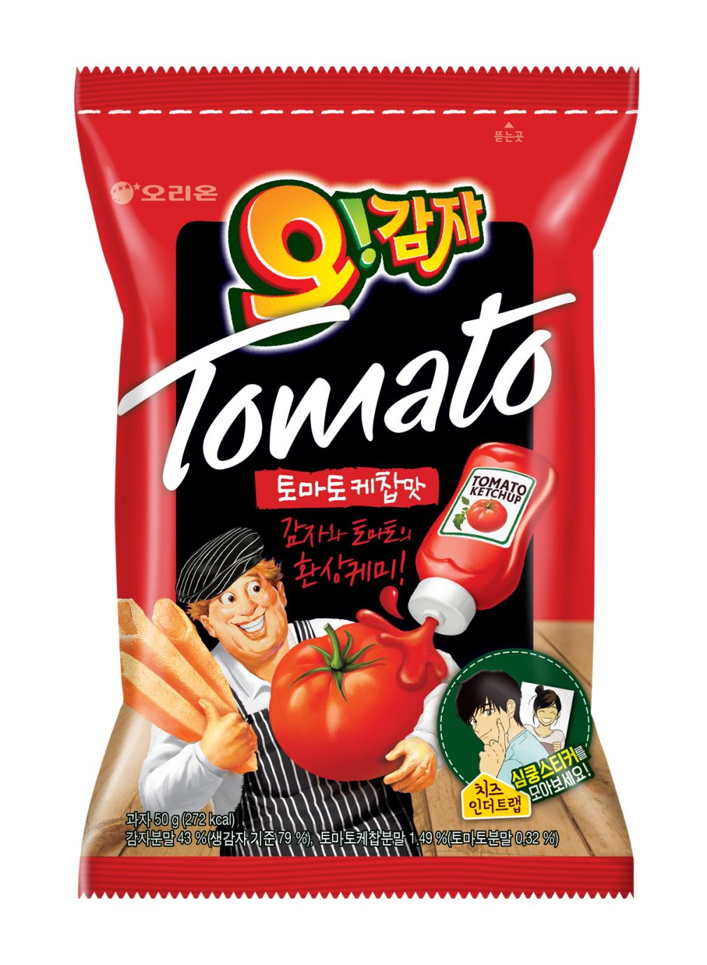 [아시아경제 이주현 기자]오리온은 기존 오!감자에 감자와 최고의 궁합을 자랑하는 토마토케찹을 더한 신제품 '오!감자 토마토케찹맛'을 28일 출시했다.오!감자 토마토케찹맛은 바삭한 오!감자에 토마토케찹의 새콤달콤한 맛이 더해져 입 안에서 녹아 없어지는 독특한 식감이 특징이다. 오리온은 감자튀김을 먹을 때 소스로 토마토케찹을 많이 찾는 데서 착안, 감자 스낵에 최적화된 토마토케찹맛 시즈닝을 개발했다고 밝혔다. 토마토는 세계인이 가장 많이 먹는 채소로 알려져 있으며 국내에선 최근 '쿡방' 열풍 속에 대세 식재료로 급부상하고 있다. 오리온은 토마토를 활용한 오!감자 토마토케찹맛이 짭짤한맛과 단맛 위주의 스낵시장에서 새로운 트렌드를 만들 것으로 기대하고 있다.이와 함께 네이버 인기 웹툰 '치즈인더트랩'(일명 치인트)과의 컬래버레이션을 통해 유정, 백인호, 홍설 등 인기 등장인물 캐릭터를 30종의 '심쿵스티커'로 만들어 제품과 함께 제공하는 등 먹는 즐거움에 스티커 모으는 재미도 함께 전한다.오!감자는 가운데 구멍이 뚫린 스틱형 감자스낵으로 1999년 출시 이후 '맛도 모양도 별난 과자'라는 콘셉트로 꾸준한 인기를 얻고 있다. 국내뿐 아니라 중국, 베트남 등 해외에서도 제품력을 인정받아 지난 한 해 동안 약 3000억원의 매출을 올렸다.오리온 관계자는 “새로운 맛을 추구하는 소비자들의 요구에 부응하기 위해 오!감자 토마토케찹맛을 출시했다”며 “2016년 국내 스낵시장에 새로운 트렌드로 떠오를 것”이라고 말했다.이주현 기자 jhjh13@asiae.co.kr<ⓒ세계를 보는 창 경제를 보는 눈, 아시아경제(www.asiae.co.kr) 무단전재 배포금지>