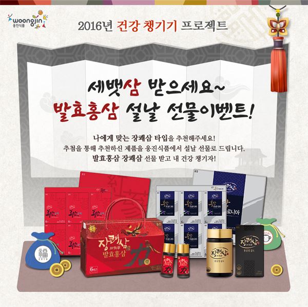 [아시아경제 이주현 기자]웅진식품은 다가오는 설 명절을 맞아 장쾌삼 추천 이벤트를 진행한다. 장쾌삼은 1976년 출시돼 40년의 역사를 갖고 있는 웅진식품의 홍삼 브랜드다.이번 이벤트는 웅진식품 홈페이지에서 진행된다. 장쾌삼 홍삼정 골드, 홍삼순액, 발효홍삼력, 홍삼 아로니아 네 가지 제품 중 다른 사람에게 추천하고 싶은 제품에 투표하면 응모가 완료된다. 제품별로 2명씩 총 8명에게 투표한 제품을 경품으로 제공한다. 이벤트는 2월10일까지 진행되며 당첨자 발표일은 2월12일이다. 장쾌삼 홍삼정 골드는 홍삼을 진하게 달여낸 100% 프리미엄 홍삼 농축액이다. 홍삼순액은 홍삼을 물에 우려내 부드럽고 순한 홍삼 추출액이고 발효홍삼력은 사포닌의 체내 흡수율을 높인 발효홍삼 농축액에 한방소재를 배합해 만들었다. 홍삼 아로니아는 항산화성분이 풍부한 수퍼푸드 아로니아 과즙에 홍삼을 더한 제품이다. 이주현 기자 jhjh13@asiae.co.kr<ⓒ세계를 보는 창 경제를 보는 눈, 아시아경제(www.asiae.co.kr) 무단전재 배포금지>