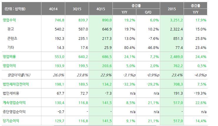 [아시아경제 한진주 기자] 네이버가 지난해 연매출로 3조원을 달성했다. 해외 매출도 1조원을 넘어섰다. 라인 광고와 국내 모바일 광고 매출이 늘어난 영향이다.28일 네이버는 2015년 매출액이 전년 대비 17.9% 늘어난 3조2512억원을 기록했다고 밝혔다.지난해 영업이익은 7622억원, 당기순이익은 5170억원이다. 각각 전년 동기 대비 0.5%, 14.4% 늘어났다.지난해 해외매출은 총 1조836억원으로 2014년(8469억원)보다 28%나 증가했다. ◆무서운 라인 성장세= 지난해 라인은 견고한 성장세를 나타내며 전체 실적 상승을 이끌었다. 2015년 라인 매출은 총 1200억엔을 기록했다. 2014년(864억엔)과 비교하면 39.53% 증가했다.4분기 기준 라인 월 이용자 수(MAU)는 2억1500만으로 3분기보다 260만 증가했다. 주요 4개국(일본, 대만, 태국, 인도네시아)에서는 715만명이 늘었지만 다른 지역에서는 감소했다.4분기 라인 매출은 전년 동기 대비 26.0% 늘어난 326억엔(한화 약 3317억원)을 기록했다. 사업별 매출은 광고 33%, 게임 37%, 스티커 23%, 기타 7%다. 이중에서도 광고 매출은 전년 동기 대비 53% 증가했다. 황인준 네이버 CFO는 "라인의 4분기 실적을 별도로 봤을 때 소폭 적자를 기록했지만 연말 상여 등 인건비와 마케팅 비용이 증가한 영향"이라며 "2016년에는 전반적으로 흑자 전환이 예상된다"고 말했다.라인은 향후 4만5000여개 가맹점을 확보한 라인예약(라인 구르메)을 라인앳과 연동하는 방안도 고려하고 있다. 라인망가, 라인뉴스, 라인라이브 등의 서비스들은 플랫폼으로 성장시킨다는 계획이다. 황인준 CFO는 "라인에서 O2O 사업과 관련해 외부 제휴 통한 확대를 고민중이며, 타임라인 광고는 일본에서 테스트한 후 다른 지역에도 확대할 가능성이 있다"고 설명했다.◆네이버 '모바일 광고' 쑥쑥= 네이버의 4분기 사업별 매출은 ▲광고 6469억원(73%) ▲콘텐츠 2173억원(24%) ▲기타 259억원(3%)이다. 전체 매출 중 모바일 비중은 56%, PC는 44%를 차지했다.네이버의 광고 매출에서 PC 비중은 줄고 모바일 비중이 꾸준히 늘고 있다. 광고 매출에서 지난해 4분기 33%였던 모바일 광고는 올해 4분기 45%까지 상승했다. 4분기 검색광고의 모바일 비중은 42%, 디스플레이 광고에서 모바일 비중은 28%를 차지했다.네이버는 올해 네이버페이 서비스 외연을 확대하는데 집중한다는 전략이다. 대형가맹점을 확보하고 교통카드 기능을 추가하는 한편, 플라스틱 카드와 연계해 오프라인에서도 '끊김없는 서비스'를 구현한다. 네이버페이 이용자 충성도를 높이기 위해 포인트 적립금 마케팅도 꾸준히 이어갈 계획이다. 황인준 CFO는 "올해 네이버페이 포인트 마케팅 비용으로 600억원 가량이 소요될 것으로 예상한다"며 "네이버페이 사업을 크게 확대하는 것이 검색광고 등 광고사업에 영향을 미칠 것"이라고 설명했다.한편 이날 네이버는 자회사 캠프모바일에 500억원의 유상증자를 실시한다고 공시했다. 네이버 자회사 캠프모바일은 '밴드'를 앞세워 동남아 지역에서 서비스를 확대하고 있지만 매출에 크게 기여하지 못하고 있는 상황이다. 네이버 측은 "밴드가 활성화됨에 따라 비용이 발생하고 있는데, 그에 반해 매출은 미미한 상태"라며 "유상증자는 동남아, 남미 등 해외 사업 강화 위한 자금확보 차원에서 진행한 것"이라고 말했다.한진주 기자 truepearl@asiae.co.kr<ⓒ세계를 보는 창 경제를 보는 눈, 아시아경제(www.asiae.co.kr) 무단전재 배포금지>