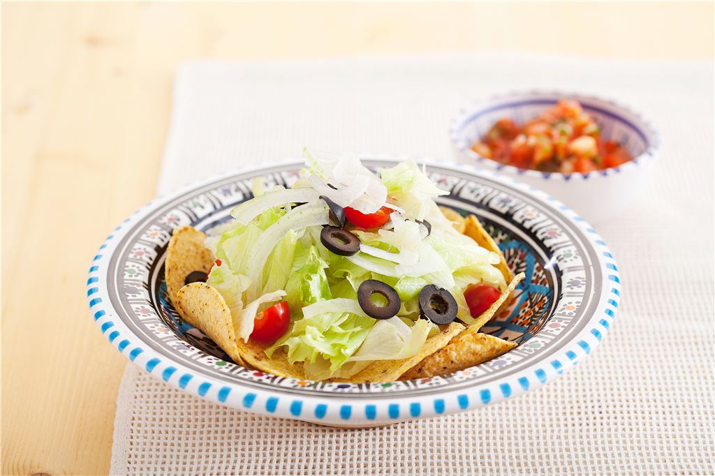 4. 접시에 나초칩을 담고 채소와 블랙 올리브를 얹고 살사 소스를 뿌린다.<br />
