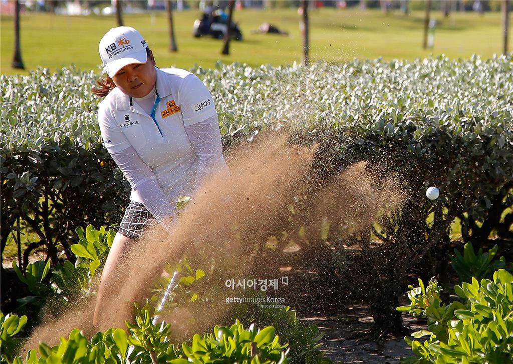 박인비가 바하마클래식 첫날 7번홀 덤불 속에서 트러블 샷을 하고 있다. 바하마=Getty images/멀티비츠