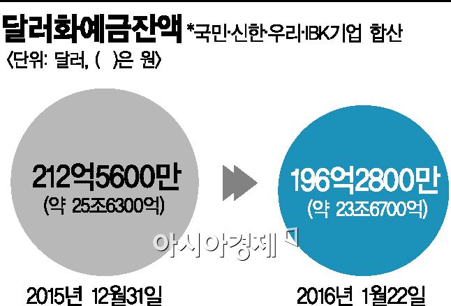 [아시아경제 구채은 기자] 원ㆍ달러환율이 1200원선을 뚫으면서 시중은행의 달러화예금이 되레 크게 줄어든 것으로 나타났다. 환율이 고점에 올라섰다고 보고 차익실현에 나선 예금자들이 늘어난 영향이다. 29일 KB국민ㆍ신한ㆍ우리ㆍIBK기업은행에 따르면 이들 4대 은행의 전체 달러화예금 잔액은 지난해 12월말 212억5600만달러(약 25조6300억)에서 이달 22일 기준 196억2800억달러(약 23조6700억)로 감소했다. 한달여만에 16억2700만달러(8%), 원화로 2조원 수준이 줄어든 것이다. 4대은행의 달러화예금은 한달새 5~10% 수준으로 모두 감소한 것으로 나타났다. 이는 지난해 달러화 예금에 거액의 뭉칫돈이 몰려 잔액 기준 매달 사상 최대치를 기록했던 것과는 대조적이다. 한국은행에 따르면 지난해말 기준 거주자의 달러화 예금잔액은 472억5000만 달러로 2014년말 360억달러에서 112억5000만 달러(31%)나 증가했다. 하지만 이달 들어서는 예금 규모가 감소했다. 연초부터 북한 수소탄 실험, 헤알화ㆍ루블화 등 신흥국 화폐 가치 급락으로 강(强)달러 현상이 심화되면서 환율이 1200원선 고점을 돌파했기 때문이다. 원ㆍ달러 환율은 지난 7일 넉달만에 1200원선을 넘었고 이후로 꾸준히 오름세를 지속, 28일 1208.5원에 마감했다. 우리은행 관계자는 "고점에서 달러를 매도하려는 수출업체의 네고 물량도 영향을 줘 달러화예금이 감소한 것으로 보인다"고 설명했다. 달러화예금은 원화를 달러로 환전해 적립했다가 출금하거나 만기가 됐을 때 원화로 받는 상품이다. 환율이 추가로 오를 것이라는 관측이 커지면 환차익을 노린 기업과 개인이 달러화 예금을 늘린다. 예컨대 1달러에 1000원일때 달러화 예금에 가입한 투자자는 이후 환율이 1200원으로 상승하면 20%의 수익을 거둘 수 있다.구채은 기자 faktum@asiae.co.kr<ⓒ세계를 보는 창 경제를 보는 눈, 아시아경제(www.asiae.co.kr) 무단전재 배포금지>