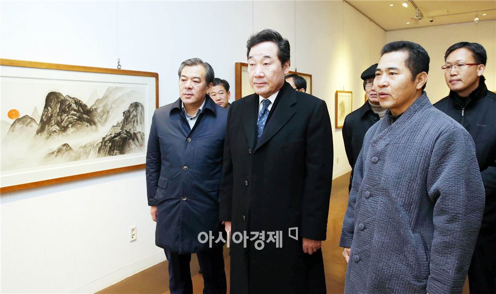 이낙연 전남지사와 유근기 곡성군수가 29일 오전 곡성군 옥과면 도립 옥과미술관을 방문, 개관 20주년을 맞아 열리고 있는 故 아산 조방원 화백 특별전을 관람하고 있다. 이선복 광주예술고등학교 교사(조방원 화백 제자)가 설명하고 있다.사진제공=전남도