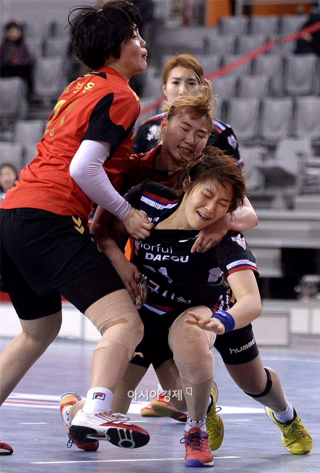 [올림픽공원=아시아경제 김현민 기자] 핸드볼 실업리그 '2016 SK 핸드볼코리아리그' 컬러풀 대구와 경남개발공사의 경기가 29일 서울 방이동 올림픽공원 핸드볼경기장에 열렸다. 대구 구예진이 상대 거친 수비에 고전하고 있다. 김현민 기자 kimhyun81@asiae.co.kr<ⓒ세계를 보는 창 경제를 보는 눈, 아시아경제(www.asiae.co.kr) 무단전재 배포금지>