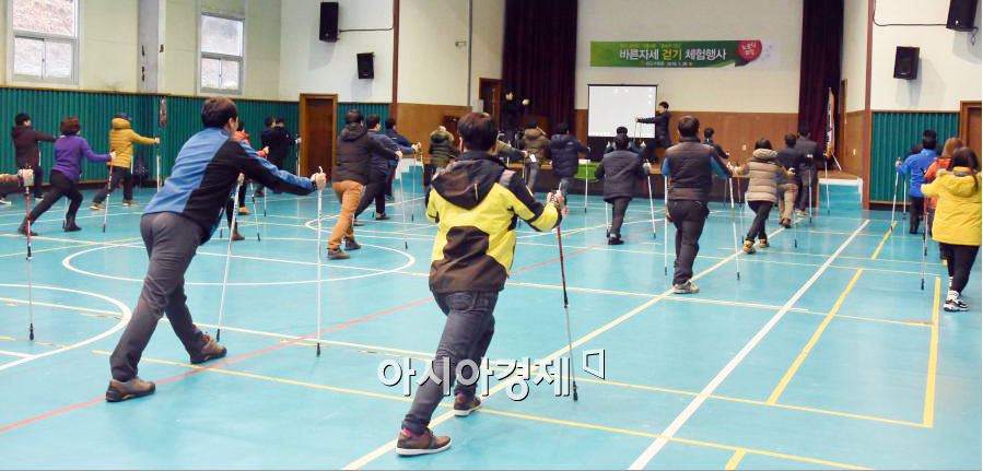 전라남도 완도수목원은 1월 29일 우천으로 인해 전라남도 청소년수련원 체육관에서 완도군생활체육회, 등산동호회원, 완도군산림조합, 공무원 등 완도군민들을 대상으로 노르딕워킹을 접목한 바른자세 걷기 체험행사를 개최했다.<br />
