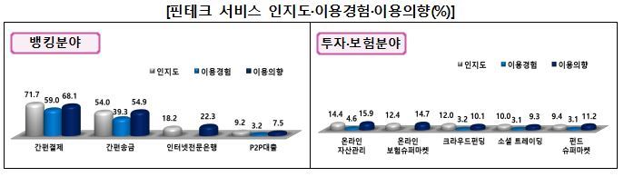 [아시아경제 한진주 기자] 인터넷 이용자 10명 중 6명은 간편결제 서비스를 이용해본 것으로 조사됐다. 모바일 쇼핑을 즐겨 쓰는 이용자가 늘면서 간편결제 이용률도 늘어난 것으로 분석된다. 31일 미래창조과학부와 한국인터넷진흥원은 만 12~59세 인터넷 이용자 5000명을 대상으로 실시한 2015년 인터넷경제활동 실태조사 결과를 발표했다.이번 조사 결과 배달과 숙박, 부동산 등 'O2O 서비스'와 '핀테크 서비스'의 이용자 수용도가 높았다. '온라인'에 국한됐던 인터넷산업이 점차 영역을 넓히면서 온라인과 오프라인의 경계가 허물어지고 있다. ◆모바일 쇼핑 늘자 간편결제 찾는 이용자도 늘어= 온라인 쇼핑 이용률이 늘어나면서 신속하고 간단한 결제·송금 수단도 각광받고 있다. 핀테크 서비스 중 이용경험 조사 결과 ▲간편결제(59.0%) ▲간편송금(39.3%) ▲P2P대출(3.2%) 순으로 나타났다. 이용자들은 간편결제 서비스를 사용하는 이유에 대해 '결제 과정이 신속해서(48.2)', '결제과정이 간편해서(35.7%)', '결제시 혜택이 많아서(11.1%)'라고 답했다. 이용하지 않는 이유로 '기존방식이 익숙해서(25.4%), '개인정보 유출 불안(25.2%)' 등을 꼽았다.이용 의향이 높은 서비스도 간편결제(68.1%)가 가장 높은 응답률을 기록했고 그 다음은 ▲간편송금(54.9%) ▲인터넷전문은행(22.3%) ▲P2P대출(7.5%) 순서였다.아직 서비스가 시작되지 않은 '인터넷전문은행'에 대한 기대감도 높은 편이다. 이용자들은 '24시간 이용할 수 있고(22.2%)', '일반은행보다 금리가 유리해서(22.0%)', '시간을 절약할 수 있어서(17.7%)' 이용할 의향이 있다고 답했다. 한편 온라인 자산관리, 보험슈퍼마켓, 크라우드펀딩 등은 이용 경험이 뱅킹 서비스에 비해 낮다. 이용 의향은 10%대 응답률을 기록해 상대적으로 낮은 수준을 보였다.핀테크 서비스를 이용할 때 가장 선호도가 높은 인증수단은 '휴대폰 문자인증(74.3%)'이었고 공인인증서(70.5%), i-PIN(30.6%)이 그 뒤를 이었다. 이용 경험은 ▲공인인증서(73.8%) ▲휴대폰 문자인증(70.6%) ▲i-PIN(48.8%) 순서였다.