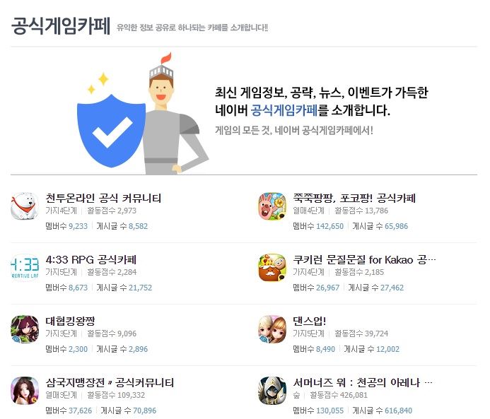 네이버 카페는 게임 업체들에게는 필수적으로 관리해야하는 소통 창구다. 게임 이용자들은 네이버 카페에서 의견을 공유하고 게임 업체들도 공지 사항을 카페를 통해 전달하고 있다. 네이버 카페에서 별도로 운영하는 '공식게임카페'에 등록된 카페는 240여개다. 가입자 수가 10만명이 넘는 카페가 27개이고 모바일 게임 '세븐나이츠' 공식 카페는 111만명이 가입할 정도로 활발히 운영되고 있다.이미 올해 1분기까지 넥슨, 넷마블 등 총 20여개의 게임 업체가 네이버 카페 SDK를 적용할 계획이다. 또 '갓 오브 하이스쿨' 등 웹툰을 기반으로 한 모바일 게임이 흥행을 거두면서 네이버는 웹툰과 모바일 게임의 시너지를 강화하고 있다. 네이버는 네이버 웹툰에 해당 게임을 홍보하는 배너광고를 탑재할뿐 아니라 게임을 곧장 다운로드 받을 수 있는 기능도 추가할 계획이다.포털 업계 관계자는 "포털서비스 이용자층과 모바일 게임 이용자층이 겹치기 때문에 시너지를 낼 수 있을 것으로 판단하고 있다"며 "게임과 다른 서비스를 연계해 선순환 구조를 만들 계획"이라고 말했다. 안하늘 기자 ahn708@asiae.co.kr<ⓒ세계를 보는 창 경제를 보는 눈, 아시아경제(www.asiae.co.kr) 무단전재 배포금지>