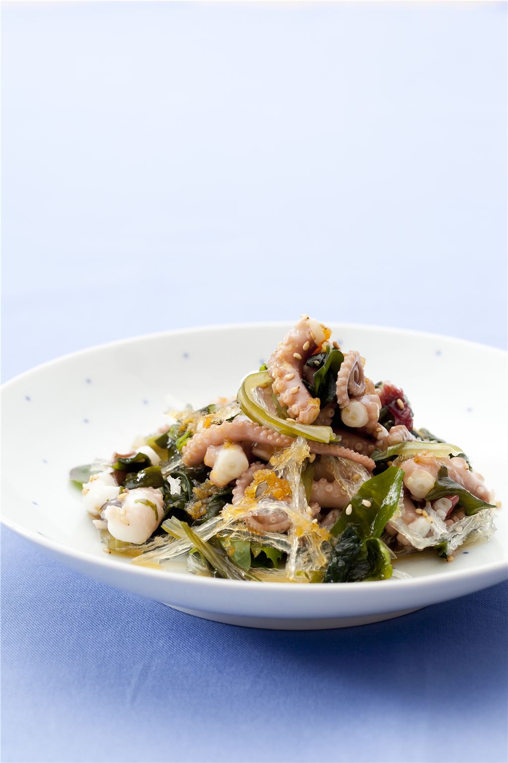 4. 손질한 낙지는 먹기 좋은 크기로 썰어서 끓는 물에 살짝 데치고 해초는 찬물에 불려 헹구어 체에 밭쳐 물기를 뺀다.<br />
