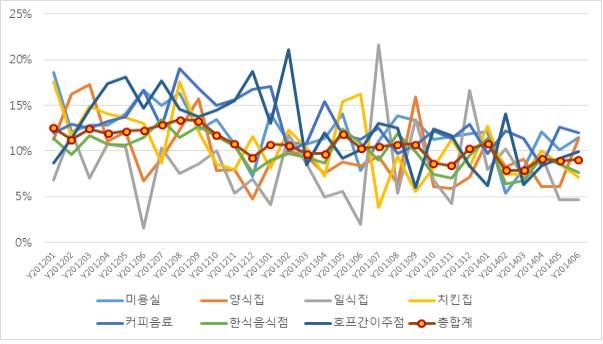 업종 별로 치킨집은 2~3월, 7~9월 사이에 개업한 곳들은 1년 이내 문을 닫는 확률이 11%대로 낮았다. 반면 사람들이 나들이를 많이 가는 시기인 4~6월(4월 13.34%, 5월 15.68%, 6월 16.09%)이나 11월(14.69%)에 개업한 치킨집들은 1년 이내 폐업률이 상대적으로 높았다. 특히 12월에 개업한 치킨집의 1년 이내 폐업률은 17.5%로 가장 높았다. 치킨집은 주로 가족 수요가 많은 데, 12월엔 송년회 모임 등이 많아 수요가 급격히 줄어든 탓으로 보인다. 호프간이주점의 개업은 되도록 2월을 피하는 게 좋다. 1년 이내 폐업률이 19.2%로 가장 높은 시기다. 5월도 1년 이내 폐업률이 18.28%에 달해 조심할 필요가 있다. 반면 3월은 1년 이내 폐업률이 15.7%로 가장 낮았다. 일식집은 5월에 개업하면 생존확률이 높은 것으로 나타났다. 1년 이내 폐업률이 9.92%로 최저를 기록하는 시기다. 그러나 1월(15.45%), 12월(13.93%) 등 한 겨울에는 1년 이내 폐업률이 상대적으로 높아 주의가 요구된다. 일식집의 경우 창업 자본 규모가 커 진입장벽이 높은 데다 수요가 안정적이라 조기 폐업률이 10% 초반에 그쳐 타 업종에 비해 안정적인 것으로 분석됐다. 미용실은 1월 개업(17.62%)을 삼가해야 하며, 커피음료점은 5월(19.07%)과 8월(19.32%) 개업을 유의할 필요가 있다. 특히 갈수록 경쟁이 치열해지는 커피음료점은 7대 주요 창업 업종 중 2월을 제외한 전월에서 1년 이내 폐업률이 수위를 달려 '요주의 대상'으로 꼽혔다. 한식음식점은 개업월별 조기 폐업률이 1년 내내 13~14%에 고정돼 계절 요인을 가장 타지 않는 업종인 것으로나타났다.서울 주요 자영업 1년 이내 폐업률 변화 추이(최근 3년간, 월별)