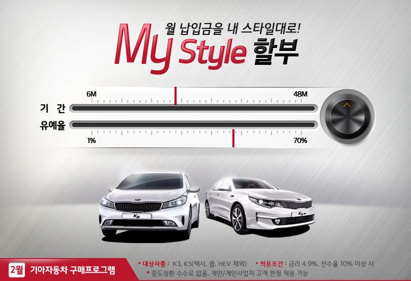 [아시아경제 송화정 기자]할부기간과 유예율을 고객이 직접 정할 수 있는 획기적인 프로그램이 탄생했다.기아자동차는 4일 차량 구매 시 고객이 자신이 정한 할부기간과 유예율에 맞춰 금액을 납부할 수 있도록 한 신개념 자동차 금융상품인 '마이스타일 할부 프로그램'을 업계 최초로 출시했다.2월 중 K3와 K5를 출고하는 고객을 대상으로 하는 이번 프로그램은 ▲고객이 6개월에서 최대 48개월의 할부기간 중 자신이 원하는 할부기간을 택할 수 있는 것은 물론, ▲할부기간과 상관없이 최저 1%에서 최대 70% 범위 내에서 유예율을 정할 수 있도록 한 것이 특징이다. (단, 선수율 10% 이상 설정 시, 개인 및 개인사업자 고객 한정, K3쿱·택시·하이브리드 제외)마이스타일 할부 프로그램은 연 4.9%의 금리가 일괄 적용되며 할부기간은 6개월 단위로, 유예율은 1% 단위로 선택할 수 있다.예를 들어 차량가격이 1735만 원인 K3 가솔린 트렌디 모델을 구매한 고객이 선수율 10%, 할부기간 48개월, 유예율 70%를 선택하는 경우 매달 13만원 가량을 납부하고 차량대금은 중도상환하거나 할부기간 종료 후 상환하면 된다.일반형 할부(4.9%, 선수율 10%)를 이용해서 같은 차를 구매하는 경우 한 달에 약 48만원을 내야 하는 것과 비교할 때 월 납부금액을 크게 줄일 수 있다는 장점이 있다.뿐만 아니라 고객이 원금을 언제든지 자유롭게 상환할 수 있도록 중도상환수수료를 없앴고 할부기간이 끝난 뒤에는 차량을 판매해 남은 대금을 납부할 수도 있어 사회 초년생 등에게 최적의 선택이 될 것으로 기아차는 기대하고 있다.또한 기아차는 2월 중 K3와 K5를 출고하는 고객을 위한 다양한 이벤트를 마련했다.우선 마이스타일 할부 프로그램 출시를 기념해 2월 한 달 동안 K3, K5를 출고하는 고객에게 최고급 의류관리기 'LG 트롬 스타일러'를 증정하는 이벤트를 진행한다. (LG 트롬 스타일러 선택 시 기본조건 50만 원 차감, 저금리 할부 프로그램 선택 시 불가, 개인과 개인사업자 고객 한정, K3쿱·택시·하이브리드 제외)이와 함께 최근 개별소비세 인하를 기념해 2월 K3, K5를 구입하는 고객 전원에게 특별 추가 할인혜택 30만원을 제공하고 7년 이상 경과된 노후차량을 보유한 고객에게는 30만원 할인혜택을 추가로 지원한다.(개인과 개인사업자 고객 한정, 특별 혜택 제공의 경우 K3쿱·택시 제외)또한 2월 K3 시승 고객이 시승 후 K3를 구입하는 경우 30만 원을 추가로 제공하는 'K3 시승고객 이벤트'도 실시한다.(개인과 개인사업자 고객 한정, K3쿱 제외)이번 마이스타일 할부 프로그램과 고객 이벤트에 관한 보다 자세한 내용은 기아차 홈페이지(//www.kia.com) 내 이벤트 페이지에서 확인할 수 있다.기아차 관계자는 "마이스타일 할부 프로그램은 최근 어려운 경제 상황 등으로 차량 구입을 망설이는 고객들의 부담을 덜어주기 위해 업계 최초로 기아차가 시행하는 혁신적인 상품"이라면서 "보다 많은 고객들이 부담 없이 K3와 K5의 우수성을 체험할 수 있는 기회가 되기를 바란다"고 말했다. 송화정 기자 pancake@asiae.co.kr<ⓒ세계를 보는 창 경제를 보는 눈, 아시아경제(www.asiae.co.kr) 무단전재 배포금지>