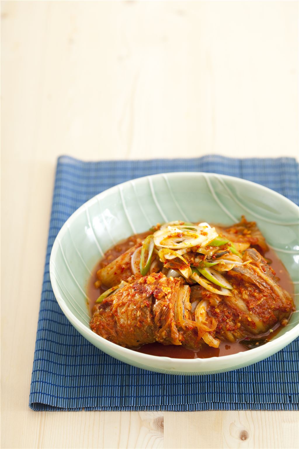 4. 묵은지를 낱장으로 떼 넓게 펼친 다음 고등어를 한 토막씩 얹어 돌돌 만다.<br />