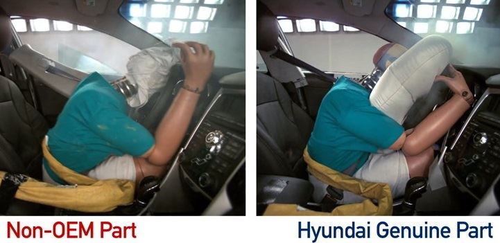 현대차가 2011년 쏘나타를 대상으로 위조부품 에어백(좌)과 순정부품 에어백(우)을 테스트한 모습<br />