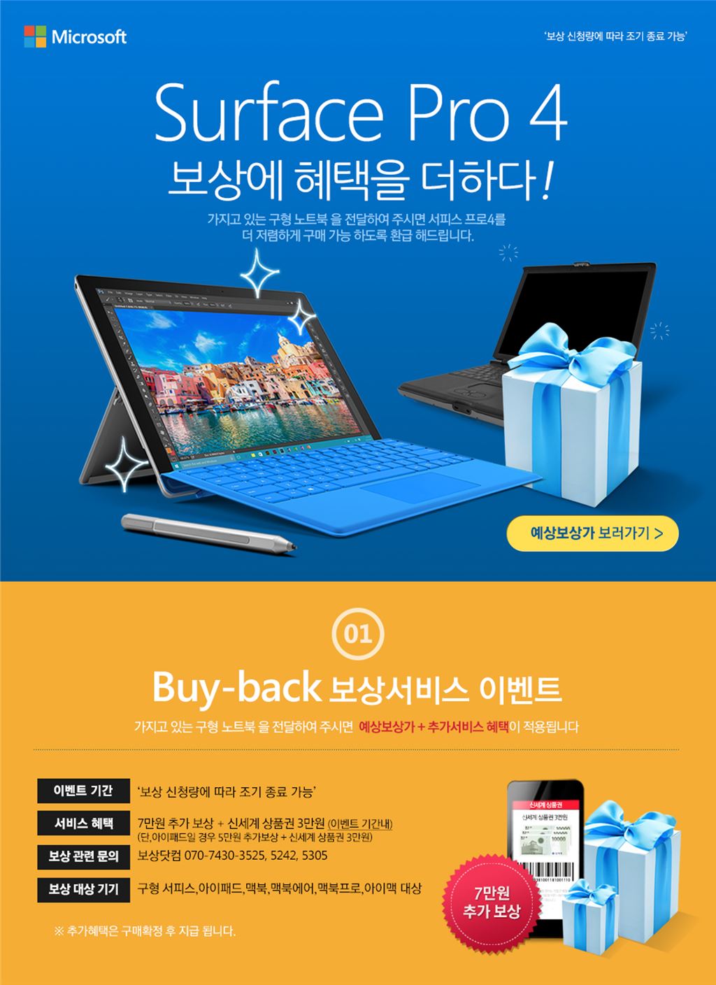 [아시아경제 한진주 기자] 한국마이크로소프트(한국MS)가 11일부터 최신 '서피스 프로 4(Surface Pro 4)' 구매 고객을 대상으로 특별 보상판매 프로모션을 실시한다. 한국MS는 3월 말까지 애플 맥북, 맥북에어, 맥북프로, 아이맥 등 중고 애플 노트북과 아이패드, 구형 서피스를 반납하면 서피스 프로 4를 저렴하게 구매할 수 있는 프로모션을 진행한다. 보유 중인 중고 맥북·서피스는 보상 금액에 7만원, 아이패드는 5만원의 추가 보상 혜택이 제공된다. 3만원 상당의 문화상품권이나 백화점 상품권이 함께 제공된다. 보상판매를 원하는 고객은 지마켓, 옥션, 11번가, 하이마트의 기획전 페이지에서 제품 구매·보상판매 신청 페이지로 이동할 수 있다. 보상 전문 쇼핑몰인 보상닷컴이 중고 제품 회수 및 보상 판매 절차를 진행한다. 보유중인 구형 제품 중 모델과 제품 카테고리를 선택하면 예상 보상금액도 확인 가능하다. 신청 후 택배를 통한 제품 회수 및 검수 작업을 거쳐 보상가가 확정되면 기본 보상금액과 추가 보상금액 환급을 받을 수 있다. 관련 문의는 보상닷컴에서 가능하다. MS는 신학기를 맞아 학생들을 위한 다양한 프로모션을 실시한다. 오는 15일부터 학생이라면 누구나 최신 서피스 프로 4를 10% 할인된 가격에 구매할 수 있는 '학생 할인 프로모션'이 시작된다.현재 11번가에서는 여학생들을 위해 서피스 3와 파우치·화장품이 함께 제공되는 패키지 프로모션을, 지마켓과 옥션에서는 서피스 3 ·서피스 프로 4 모델별 학생할인과 추가 경품을 제공하는 풀 패키지 프로모션이 진행 중이다. 장홍국 한국MS 컨슈머 사업본부 상무는 "태블릿의 이동성과 윈도우 10의 생산성을 모두 갖춘 서피스 시리즈는 출시 전 예약 판매부터 완판을 기록하며 전 세계적으로 많은 사랑을 받고 있다"며 "더 많은 국내 고객들이 서피스를 선택하고 다양한 혜택들을 제공받을 수 있도록 국내 파트너사들과 함께 지속적으로 노력하겠다"고 말했다.한진주 기자 truepearl@asiae.co.kr<ⓒ세계를 보는 창 경제를 보는 눈, 아시아경제(www.asiae.co.kr) 무단전재 배포금지>