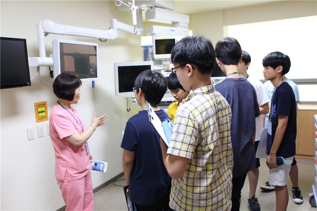 가천대 과학영재교육원생들이 길병원에서 현장학습을 하고 있다.