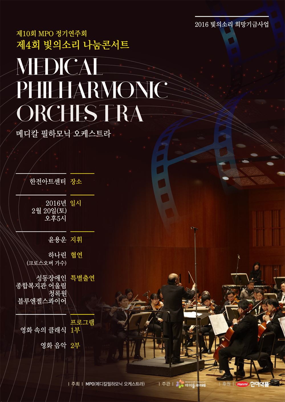 [아시아경제 권용민 기자] 현직 의사로 구성된 메디칼필하모닉오케스트라(이하 MPO)가 음악을 통한 사랑 나눔을 실천한다.MPO는 오는 20일 오후 5시 서울 양재동 한전아트센터에서 한미약품 후원으로 ‘제4회 빛의소리나눔콘서트’를전석 무료초청 공연으로 개최한다고 15일 밝혔다.빛의소리나눔콘서트는소외계층 예술교육 기금 조성을 위한 자선 음악회로,MPO의 열번째정기공연이다. 올해 콘서트는 대중에게 친숙한 영화음악이라는 주제로 1부는 영화 속 클래식을, 2부는 ‘사운드 오브 뮤직 메들리’와 타이타닉의‘My heart will go on’ 등다채로운 장르의 선율이 연주될 예정이다. 특히 빛의소리희망기금 지원으로 결성된 성동장애인종합복지관의 어린이 합창?합주단인 ‘어울림단’과 청록원의‘블루엔젤스콰이어’의오프닝 공연 및 크로스오버가수 하나린씨와의 합동 공연도 선보인다.MPO와 한미약품은 빛의소리나눔콘서트를 통해 조성한 자선기금으로 그 동안 성동장애인복지관의 어울림단과 전북 익산의 장애인종합복지시설인 청록원에 예술교육 기금을 지원해 오고 있다.MPO 유권단장은 “음악을 통해 사랑과 나눔의 가치를 실천하는 뜻깊은 콘서트를 매년 개최할 수 있어 보람을 느낀다”며“예술을 통해 변화되는 아이들의 모습에서 희망을 볼 수 있어 기쁘고 이런 희망의 메시지를 음악을 통해 전하겠다”고 말했다. 한편 MPO는 서울의대 관현악단 출신 의사들이 모여 1989년 창단한 연주단체로, 서울대병원 ‘희망의 음악회’, 정명훈과 함께하는 ‘어린이를 위한 희망 음악회’ 등 다양한 자선공연을 펼쳐 왔으며, 2013년 부터빛의소리나눔콘서트를 개최하고 있다.공연에 대한 자세한 문의는 후커뮤니케이션(02-6383-7790), 한전아트센터(02-2105-8133)로 하면 된다.권용민 기자 festym@asiae.co.kr<ⓒ세계를 보는 창 경제를 보는 눈, 아시아경제(www.asiae.co.kr) 무단전재 배포금지>