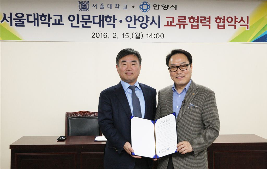 이필운 안양시장(오른쪽)과 장재성 서울대 인문대학장이 15일 인문도시 조성 협약식을 가진 뒤 기념촬영을 하고 있다.