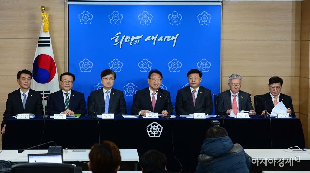 [아시아경제 백소아 기자] 17일 서울 세종로 정부서울청사에서 유일호 경제부총리(왼쪽부터 네 번째)를 비롯한 관계장관들이 무역투자진흥회의 투자 활성화 대책을 발표하고 있다. 이날 유 부총리는 "민간 투자와 신산업 발전, 수출 동력 창출을 막는 규제를 과감히 걷어내 2018년까지 약 50조 이상의 민간 투자와 일자리 블루 오션을 개척하겠다"고 말했다. 강호인 국토교통부 장관, 이동필 농림축산식품부, 최양희 미래창조과학부 장관, 유 부총리, 주형환 산업통상자원부 장관, 김종덕 문화체육부 장관, 정진엽 보건복지부 장관(왼쪽부터)백소아 기자 sharp2046@asiae.co.kr<ⓒ세계를 보는 창 경제를 보는 눈, 아시아경제(www.asiae.co.kr) 무단전재 배포금지>
