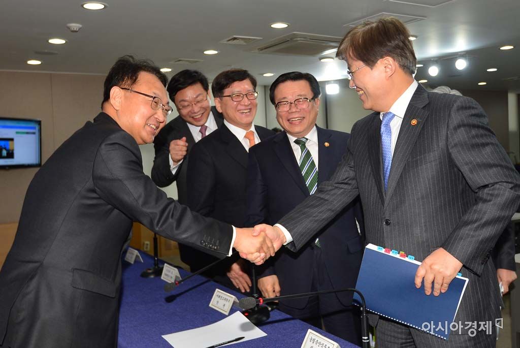[아시아경제 백소아 기자] 17일 서울 세종로 정부서울청사에서 유일호 경제부총리(맨 왼쪽)과 최양희 미래창조과학부 장관(맨 오른쪽)이 무역투자진흥회의 투자 활성화 대책을 발표한 후 악수를 하고 있다. 이날 유 부총리는 "민간 투자와 신산업 발전, 수출 동력 창출을 막는 규제를 과감히 걷어내 2018년까지 약 50조 이상의 민간 투자와 일자리 블루 오션을 개척하겠다"고 말했다.백소아 기자 sharp2046@asiae.co.kr<ⓒ세계를 보는 창 경제를 보는 눈, 아시아경제(www.asiae.co.kr) 무단전재 배포금지>