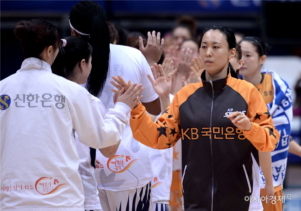 [인천=아시아경제 김현민 기자] 여자프로농구 신한은행과 KB국민은행의 경기가 17일 인천 도원체육관에서 열렸다. 국민은행 변연하가 팀의 103-79 승리를 확정한 뒤 상대 선수들과 인사하고 있다. 김현민 기자 kimhyun81@asiae.co.kr<ⓒ세계를 보는 창 경제를 보는 눈, 아시아경제(www.asiae.co.kr) 무단전재 배포금지>