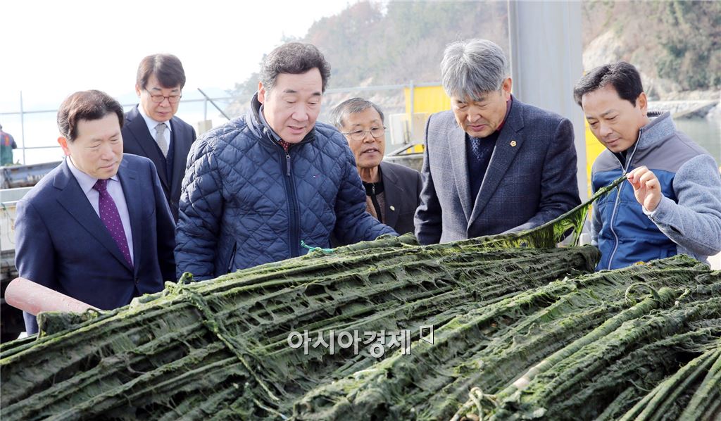이낙연 전남지사가 18일 오전 장흥군 대덕읍 옹암 어촌계를 방문, 박종태 어촌계장(오른쪽 세 번째) 안내로 매생이 세척 작업장을 둘러보고 있다. 이날 현장 방문에는 김성 장흥군수, 이충식ㆍ김광준 도의원 등이 동행했다. 사진제공=전남도