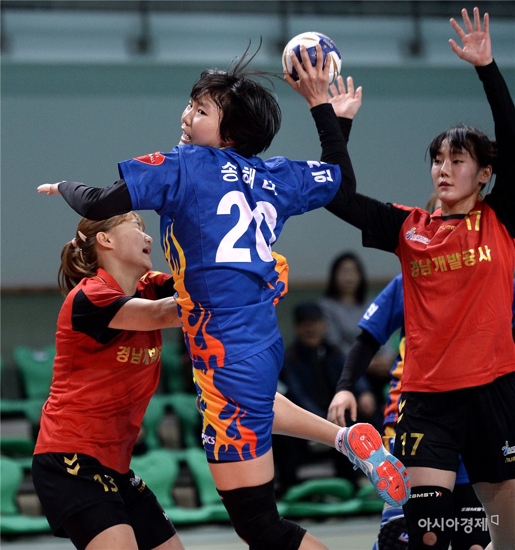 [인천=아시아경제 김현민 기자] 핸드볼 실업리그 '2016 SK 핸드볼코리아리그' 인천시청과 경남개발공사의 경기가 19일 인천 선학체육관에서 열렸다. 인천시청 송해리가 상대 수비를 뚫고 공격하고 있다. 김현민 기자 kimhyun81@asiae.co.kr<ⓒ세계를 보는 창 경제를 보는 눈, 아시아경제(www.asiae.co.kr) 무단전재 배포금지>