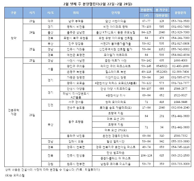[아시아경제 주상돈 기자] 21일 부동산전문 리서치업체 리얼투데이에 따르면 이번 주 전국 7곳에서 5511가구가 청약 접수를 받는다. 지난 주(442가구) 분양실적보다 1146% 증가한 물량이다. 현대산업개발은 경기 평택시 비전동 일대에 '비전 아이파크 평택'을 분양한다. 이 단지는 오는 24일 1순위 청약을 시작으로 25일 2순위 청약에 나선다. 이 단지는 쾌적한 주거환경을 자랑한다. 단지 북측으로 24만여㎡ 규모의 배다리 생태공원이 마주해 있다. 단지 서측과 남측으로 3개의 근린공원이 계획돼 있다. 이 단지는 용죽지구 A1-1블록에 위치하며 지하 1층~지상 27층 7개 동 전용면적 75~103㎡, 총 585가구로 구성된다.동문건설도 같은 날 울산 KTX역세권도시개발구역 M2블록에 분양하는 '울산 KTX신도시 동문 굿모닝힐'의 청약을 받는다. 오는 24일 1순위, 25일 2순위 순으로 청약을 접수를 받는다. 오피스텔은 3월 3~4일 이틀간 청약을 접수를 받는다. 아파트 503가구(전용면적 84~125㎡), 오피스텔 80실(전용면적 62㎡), 상가시설까지 들어서는 복합주거단지로 조성된다. 흥한주택종합건설㈜이 경남 진주시 신진주역세권 도시개발사업지구 C-1블록에 짓는 '신진주역세권 센트럴 웰가'도 청약에 돌입한다. 25일 1순위, 26일 2순위 청약을 한다. 단지가 들어서는 신진주역세권 도시개발사업지구는 진주시 가좌동 일원에 약 97만㎡ 규모로 개발되며 2만여 명을 수용하는 약 7000가구의 주거시설과 유통, 상업 시설 등이 조성될 예정이다. 단지는 지하 2층, 지상 33층, 10개동, 전용면적 59~84㎡, 총 1152가구다.모아주택산업이 경북도청이전신도시 B1-3블록에 공급하는 '모아엘가 에듀파크'는 25일과 26일 각각 1, 2순위 청약을 받는다. 경북도청이전신도시는 최근 경북도청 신청사 이전이 시작돼 미래가치에 대한 기대가 높아진 지역으로, 올해 첫 분양인 금번 분양 소식 역시 많은 관심을 모으고 있다. 특히 이 단지는 1행정타운과 2행정타운의 인프라를 모두 누릴 수 있는 위치에 입지해 더욱 가치가 높다는 평이다. '모아엘가 에듀파크'는 전체 593가구 모두 수요 선호도가 가장 높은 전용면적 84㎡의 단일면적으로 구성됐다.견본주택 개관을 앞두고 있는 곳은 15곳이다. 당첨자발표는 5곳, 계약은 10곳에서 이뤄진다.삼성물산은 26일 서울 광진구 구의1구역 단독주택을 재건축한 '래미안 구의 파크스위트'의 견본주택을 개관한다. 지하철 5호선 아차산역을 걸어서 이용할 수 있고 광나루로, 자양로, 천호대로, 올림픽대교 등을 통한 강남 및 도심권 업무지역으로의 접근성도 좋다. 단지는 지하 3층, 지상 10~23층 12개동, 전용면적 59~145㎡ 총 854가구 규모로, 이 중 조합분을 제외한 502가구가 일반에 분양된다. 전용 84㎡ 이하 중소형이 전체의 90%에 이른다.같은 날 현대건설도 녹번 1-1 주택 재개발 구역인 서울시 은평구 녹번동 53번지 일대에 '힐스테이트 녹번'을 분양한다. 3호선 녹번역 바로 앞에 위치한 초역세권 단지로 북한산 국립공원, 불광 근린공원, 독바위 공원이 단지에서 가깝다. 또한, 단지 내에는 북한산 둘레길을 테마로 한 산책로가 조성될 예정이다. 이 단지는 지하 3층~지상 20층, 13개 동, 전용면적 49~118㎡, 총 952가구 규모로 이 중 일반 분양은 260가구다.㈜모아종합건설도 인천광역시 청라지구 A1블록에 짓는 '청라 모아미래도'의 견본주택을 오픈하고 본격 분양에 나선다. 특히 청라지구에 부족한 소형평형으로 희소가치까지 누릴 수 있으며 합리적인 분양가로 공급 될 예정이다. 무엇보다 소형평형임에도 불구하고 판상형 4베이 맞통풍 구조, 펜트리 및 드레스룸 등의 공간확보로 생활편의성을 높였다. 일부 가구에서는 바다조망도 가능하다. 단지는 지하 1층~지상 25층, 5개동, 전용면적 71㎡ 단일면적으로 총 418가구 규모다. 롯데자산개발은 송도국제업무단지 A1블록에 초대형 규모의 오피스텔인 '롯데몰 송도 캐슬파크'를 분양한다. 롯데몰 송도 캐슬파크는 롯데마트와 롯데시네마, 롯데쇼핑몰, 롯데호텔 등 롯데그룹을 대표하는 쇼핑?문화시설 롯데몰 송도와 하나의 단지를 이루고 있는 대형복합단지다. 입주민들은 입주 후 바로 롯데몰 송도의 다양한 쇼핑·문화시설을 이용할 수 있다. 이 단지는 지하 3층~지상 41층, 2개동, 총 2040실 규모로 전용면적 17~84㎡으로 구성된다. 한국토지신탁도 강원 원주시 판부면에 '남원주 코아루 미소지움'을 분양한다. 원주~강릉 간 고속화전철(2018년 개통예정), 제2영동고속도로(2016년 말 개통 예정) 등이 완공되면 수도권 지역과의 접근성도 개선될 전망이다. 남원주역사를 중심으로 복합환승터미널, 상업·주거시설, 광장, 강원 창조경제혁신센터, 창업·벤처지구 등이 조성될 계획이다. 이 단지는 지하 1층~지상 19층, 6개동 359가구 규모로 구성됐다. 전 주택형이 중소형 전용면적 59·79㎡로 이뤄졌다. 채광과 통풍, 조망을 위해 모든 가구를 남향 위주로 배치했다.주상돈 기자 don@asiae.co.kr<ⓒ세계를 보는 창 경제를 보는 눈, 아시아경제(www.asiae.co.kr) 무단전재 배포금지>