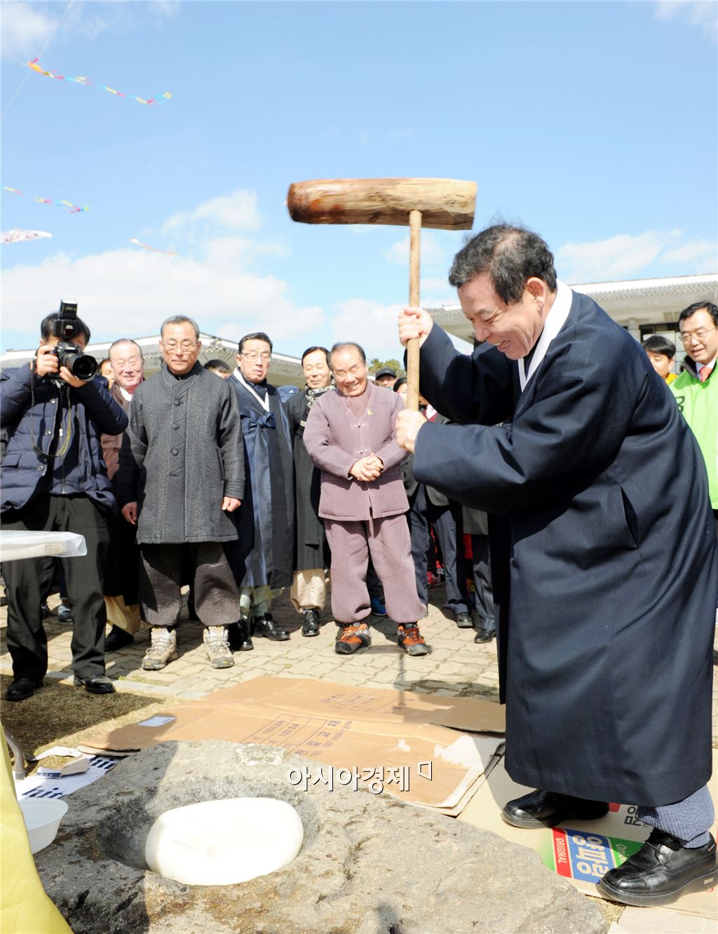 윤장현 광주광역시장은 21일 시립민속박물관에서 열린 정월대보름 한마당행사에 참석해 축하인사와 당산제에 참석후 떡메치기 체험 행사을 가졌다. 사진제공=광주시