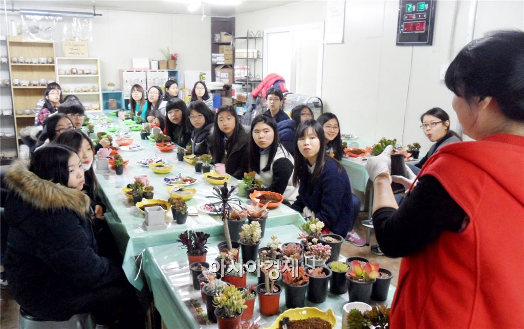 광산구는 지역 중학생 60여 명이 함께 하는 사회적경제 탐방프로그램을 19일부터 이틀간 운영했다. 학생들이 지난 19일 예비사회적기업 ㈜꽃이피었습니다를 방문해 다육식물 분갈이 설명을 듣고있다.