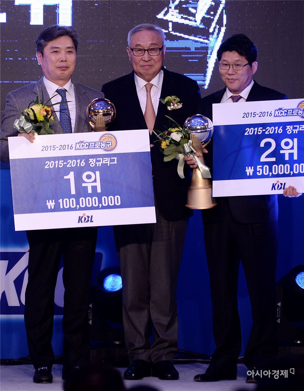 [아시아경제 김현민 기자] 2015~2016 프로농구 시상식이 22일 서울 반포동 JW메리어트 호텔에서 열렸다. 정규리그 1위를 차지한 전주 KCC 최형길 단장(왼쪽)과 2위를 차지한 울산 모비스 정호인 단장이 KBL 김영기 총재와 함께 기념촬영을 하고 있다. 김현민 기자 kimhyun81@asiae.co.kr<ⓒ세계를 보는 창 경제를 보는 눈, 아시아경제(www.asiae.co.kr) 무단전재 배포금지>