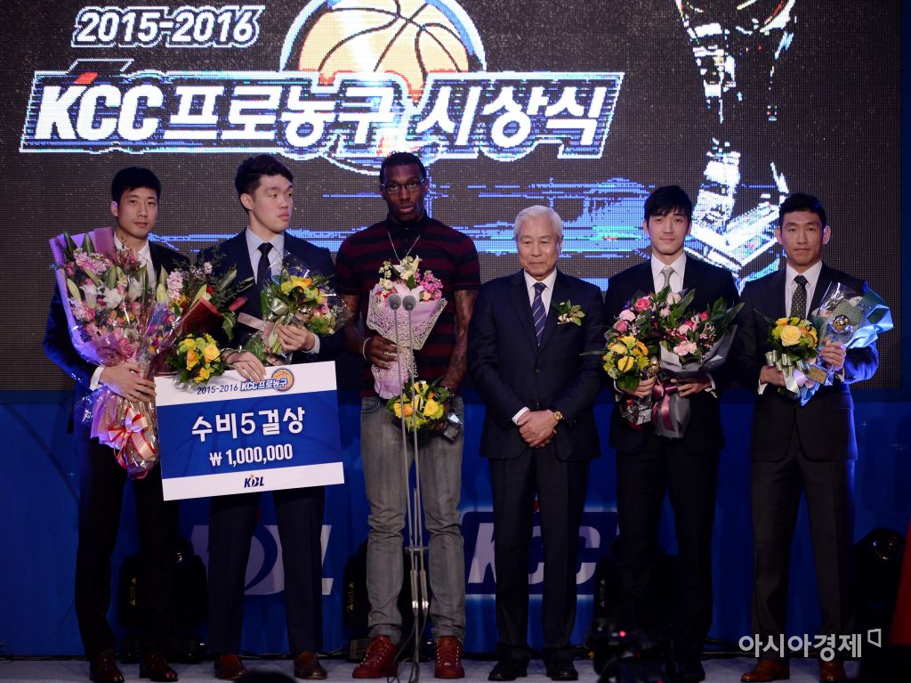 [아시아경제 김현민 기자] 2015~2016 프로농구 시상식이 22일 서울 반포동 JW메리어트 호텔에서 열렸다. KGC 양희종(왼쪽부터), 오리온 이승현, 삼성 라틀리프, KCC 신명호, 모비스 양동근이 수비 5걸상을 수상한 뒤 방열 대한농구협회 회장(오른쪽 세번째)과 기념촬영을 하고 있다. 김현민 기자 kimhyun81@asiae.co.kr<ⓒ세계를 보는 창 경제를 보는 눈, 아시아경제(www.asiae.co.kr) 무단전재 배포금지>