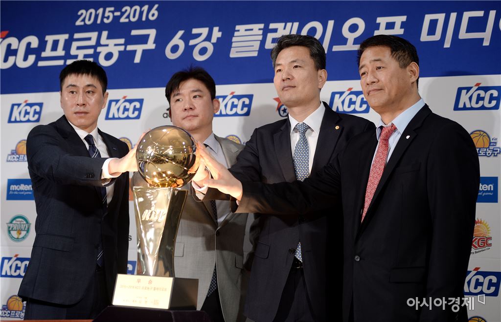 [아시아경제 김현민 기자] 2015~2016 프로농구 6강 플레이오프 미디어데이가 23일 서울 논현동 KBL사옥에서 열렸다. 삼성 이상민 감독(왼쪽부터), KGC 김승기 감독, 동부 김영만 감독, 오리온 추일승 감독이 포즈를 취하고 있다. 김현민 기자 kimhyun81@asiae.co.kr<ⓒ세계를 보는 창 경제를 보는 눈, 아시아경제(www.asiae.co.kr) 무단전재 배포금지>