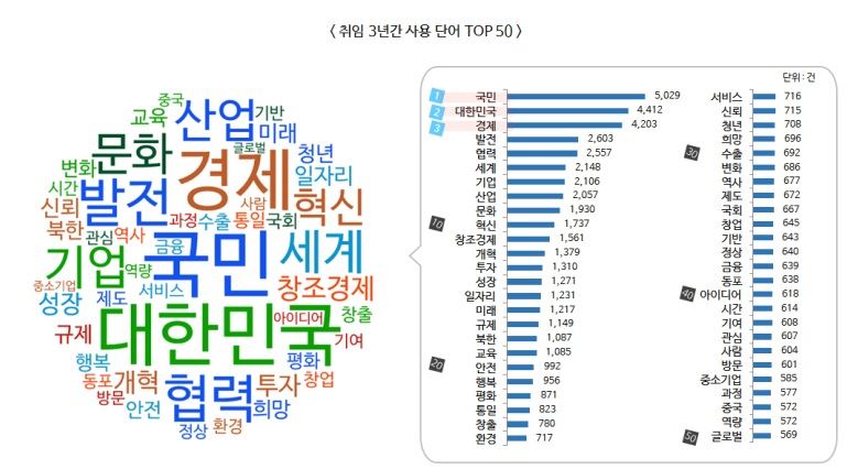 [아시아경제 신범수 기자] 박근혜 대통령이 재임 3년간 각종 회의와 연설에서 가장 자주 언급한 단어는 국민, 대한민국, 경제 순으로 나타났다. 두 의미가 결합된 단어(결합 키워드)를 기준으로 할 경우 창조경제, 경제활성화, 경제혁신 등 경제 관련 단어 사용이 두드러진 것으로 조사됐다. 이는 지난 2013년 2월 25일부터 2016년 2월 12일까지 대통령 연설문과 회의 속기록, 대변인 서면브리핑 등 총 1342건의 대통령 공개 발언록을 청와대가 빅데이터 분석한 결과다. 개별 단어 중 가장 사용빈도가 높은 단어는 국민(5029회), 대한민국(4412회), 경제(4203회), 발전(2603회), 협력(2557회) 등 순이었다. 특히 정책 관련 단어 중 경제 관련 단어 언급횟수는 총 1만7116회(66%)로 정책 관련 단어 사용 10회 중 7회를 경제관련 단어가 차지했다.전달하려는 뜻이 명확히 담겨 있는 결합키워드 대상 분석도 경제 관련 단어 사용이 압도적이었다. 창조경제(1847회) 언급이 가장 많았으며 이어 경제활성화(1535회), 경제혁신(809회), 일자리창출(648회), 평화통일(638회) 등이 뒤를 이었다. 결합키워드 상위 100개를 4대 국정기조 기준으로 분류하면 ‘경제부흥’ 관련어가 65%로 가장 많았고 이어 국민행복(15%), 평화통일 기반구축(15%), 문화융성(5%) 등의 순이었다. 신범수 기자 answer@asiae.co.kr<ⓒ세계를 보는 창 경제를 보는 눈, 아시아경제(www.asiae.co.kr) 무단전재 배포금지>