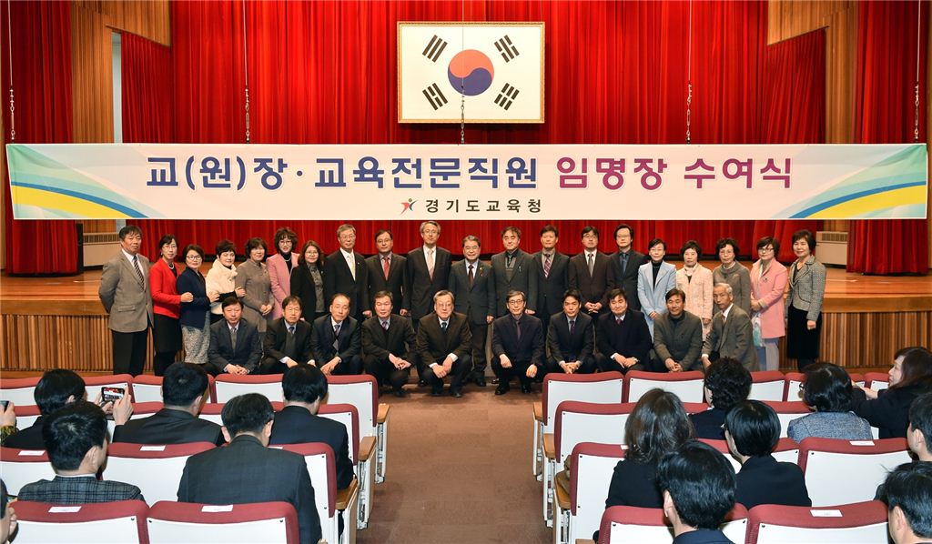 이재정 경기도교육감이 24일 다음달 1일 부임하는 교장과 교감, 교육전문직에게 임명장을 준 뒤 기념촬영을 하고 있다.