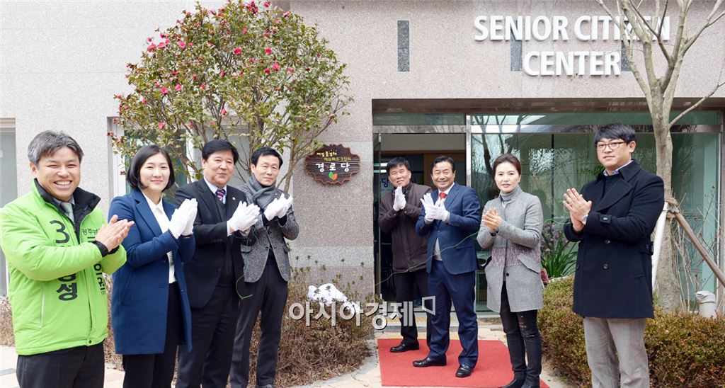 광주시 남구 효천2지구 제일풍경채 에듀파크 1단지 경로당 개소식이 열린 24일 최영호 남구청장을 비롯한 김백천 경로당회장, 내외 귀빈들이 현판식을 마치고 기념촬영을 하고 있다.사진제공=광주시 남구
