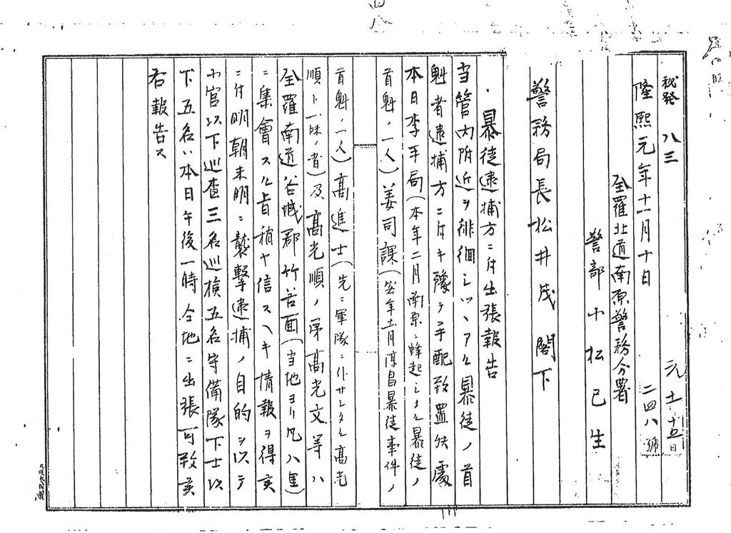 이번에 문건을 공개한 지리산권 우리문화연구소 정재상 소장(50·전 하동문화원 향토사연구위원장)은 “국가기록원에 소장중인 조선총독부 문서 ‘폭도에 관한 편책’전남경찰부장의 보고서(1908년)와 전북 남원경무분서장의 보고서(1907년) 등에서 그동안 알려지지 않은 호남출신 항일투사 36명에 관한 인적사항을 처음으로 확인했다”고 밝혔다. 문건에는 출신지 별로 주소 성명 나이 등이 구체적으로 기록돼 있다. 당시 문건에 의하면 곡성군 목사동면 구룡리 출신 배준필 부자는 같은 마을 양보신(45)과 오지면 압록리 배재용(30) 석곡면 창기리 신용섭(20) 순천시 황전면 백낙선(40) 구례군 산동면 최명서(40) 등과 함께 지리산 일대에서 일제와 맞서 싸웠다.이평국 의병장이 곡성군 죽곡면에서 강사과 고광순 고광문과 함께 의병활동을 하고 있다는 당시 일본경찰의 보고서(1907년)